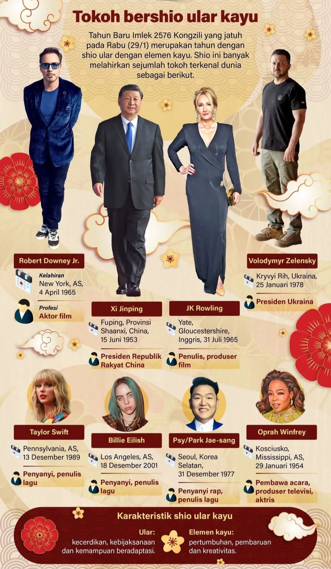 Netjournal.id – Tahun Baru Imlek 2576 Kongzili yang jatuh pada Rabu (29/1) merayakan tahun Ular Kayu. Shio yang dikenal dengan karakteristik kecerdikan, kebijaksanaan, dan kemampuan beradaptasi ini telah melahirkan sejumlah tokoh berpengaruh di berbagai bidang.