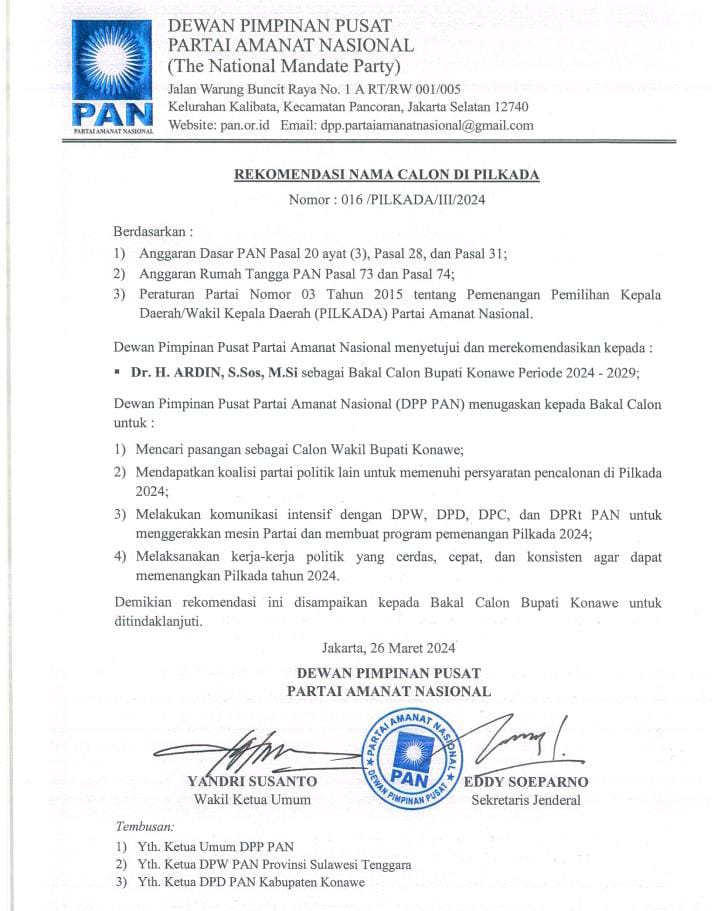 KONAWE, NETJOURNAL.ID – Dewan Pimpinan Pusat (DPP) Partai Amanat Nasional (PAN) resmi memberikan rekomendasi kepada Dr. H. Ardin, S.Sos, M.Si sebagai Bakal Calon Bupati Konawe untuk periode 2024-2029. Keputusan strategis ini diumumkan melalui surat keputusan dengan nomor: 016/PILKADA/11/2024, menjadikan Dr. H. Ardin, S.Sos., M.Si kandidat pertama yang mendapatkan dukungan partai dalam kontestasi Pilkada Konawe yang akan berlangsung serentak pada November 2024.